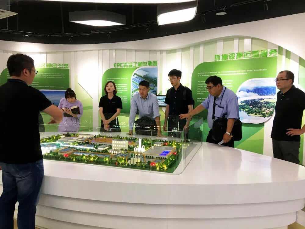 董事长蒋伟群、总经理刘郁甫热情接待,并全程陪同客人参观交流。首先,园区领导一行参观了公司综合楼展厅,蒋董事长向客人详细介绍了公司的发展历程、荣誉资质、战略规划等,并在数控中心连接了一线工程华星运营污水站现场视频,让客人直观了解到污水站的运营情况。