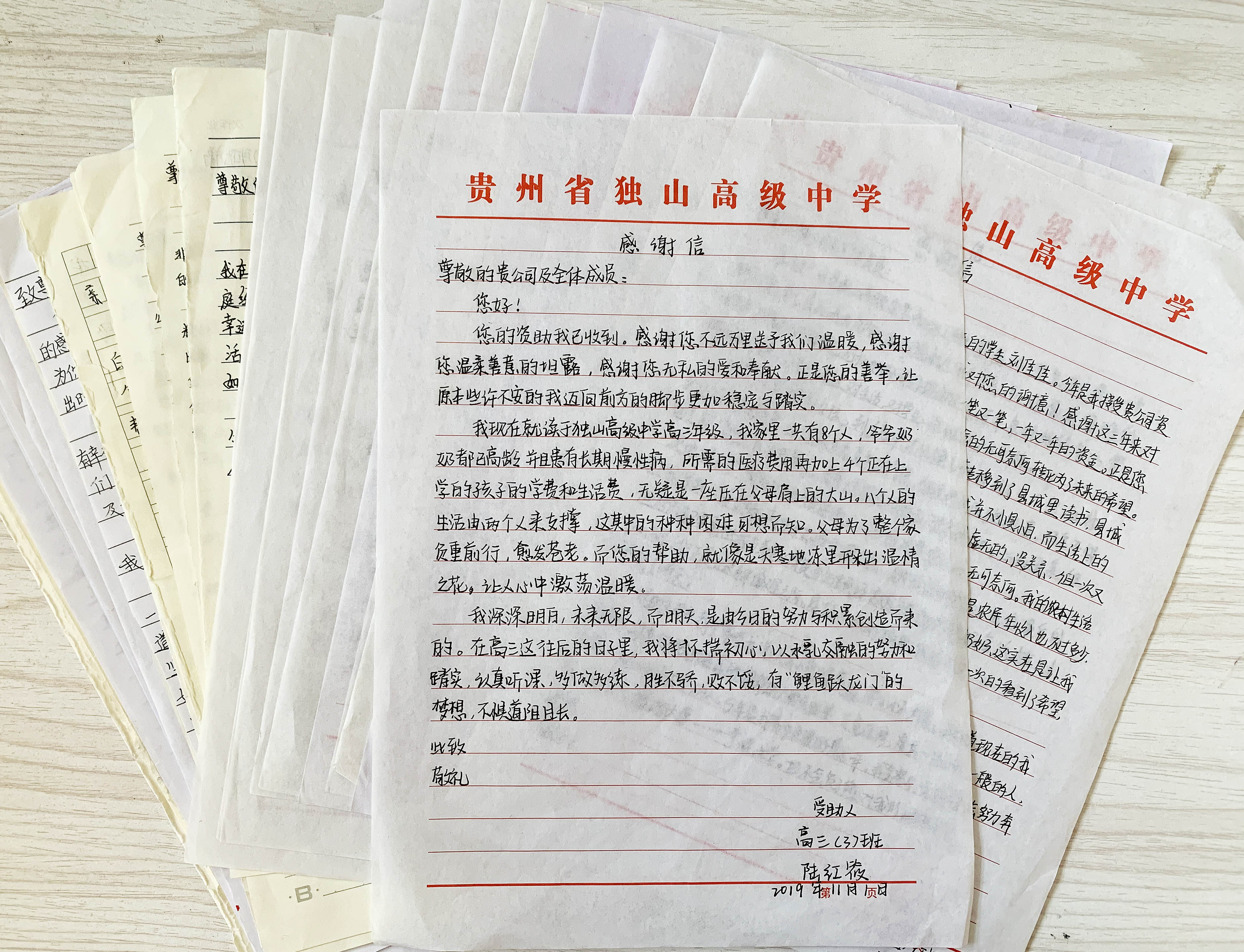 近日,我们收到了多封来自贵州独山高级中学受助学生的感谢信,信中,字里行间,表达了他们对蓝必盛深深地谢意,并立志考上大学,成长为无愧于新时代的青年人。