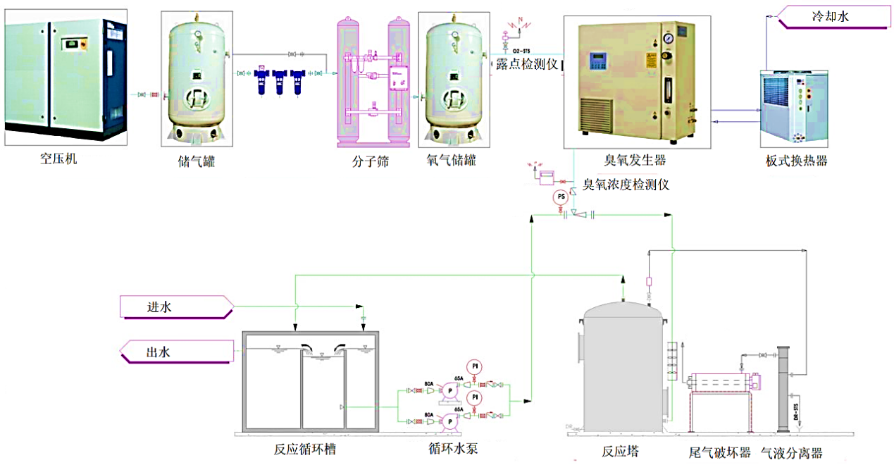 采用过氧化氢和臭氧形成双氧化反应模式,两种强氧化剂相互作用和促进,通过AOPs装置控制反应条件,一方面废水中可以易氧化的有机物被臭氧氧化;另一方面在H2O2的参与下,反应器中产生大量的羟基自由基,废水中的难降解有机物被羟基自由基氧化,实现废水的高效处理,促使出水达标排放。