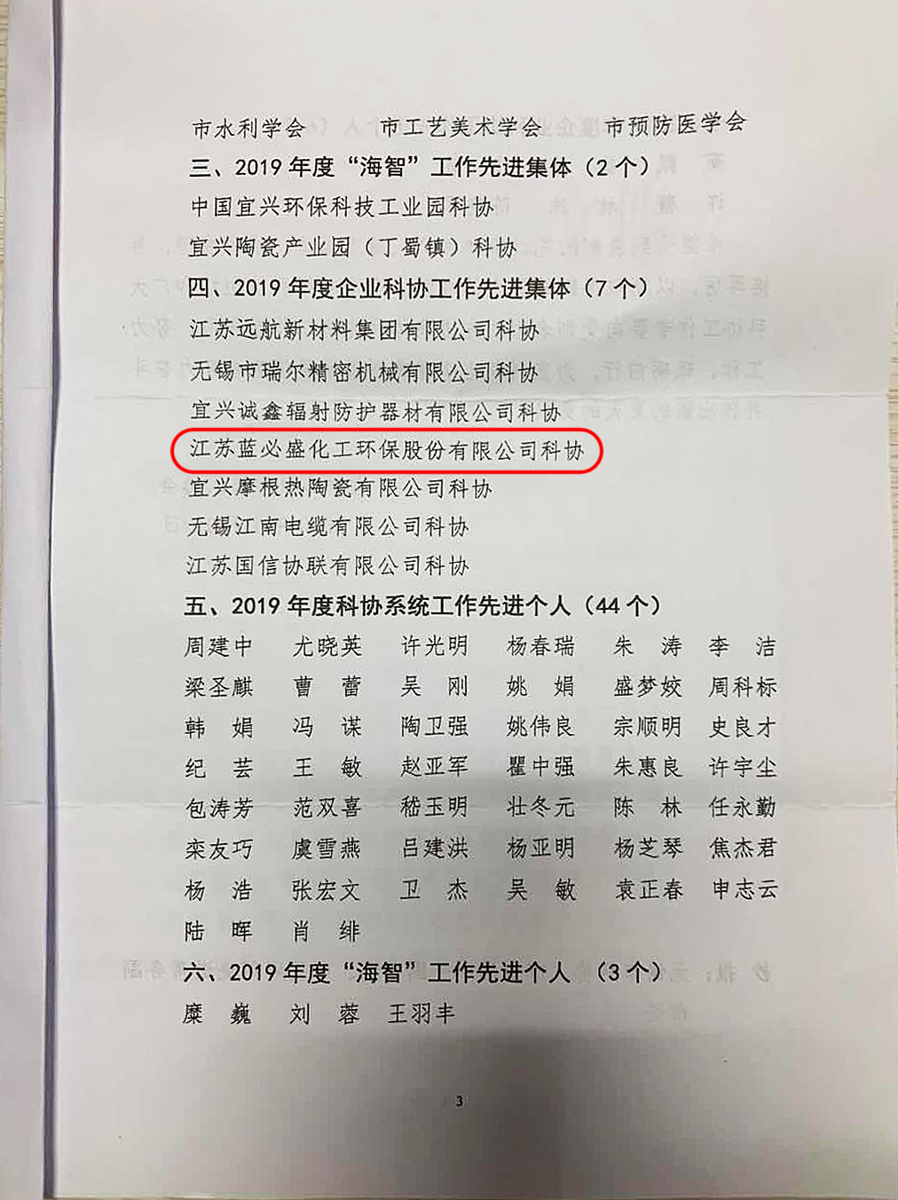 近日,宜兴市科学技术协会对2019年度全市科协工作先进集体、先进工作者进行了表彰。我公司科协在2019年度全面落实科学发展观,广泛开展科学普及和学术交流活动,工作成绩显著,为此被授予“企业科协工作先进集体”荣誉称号。