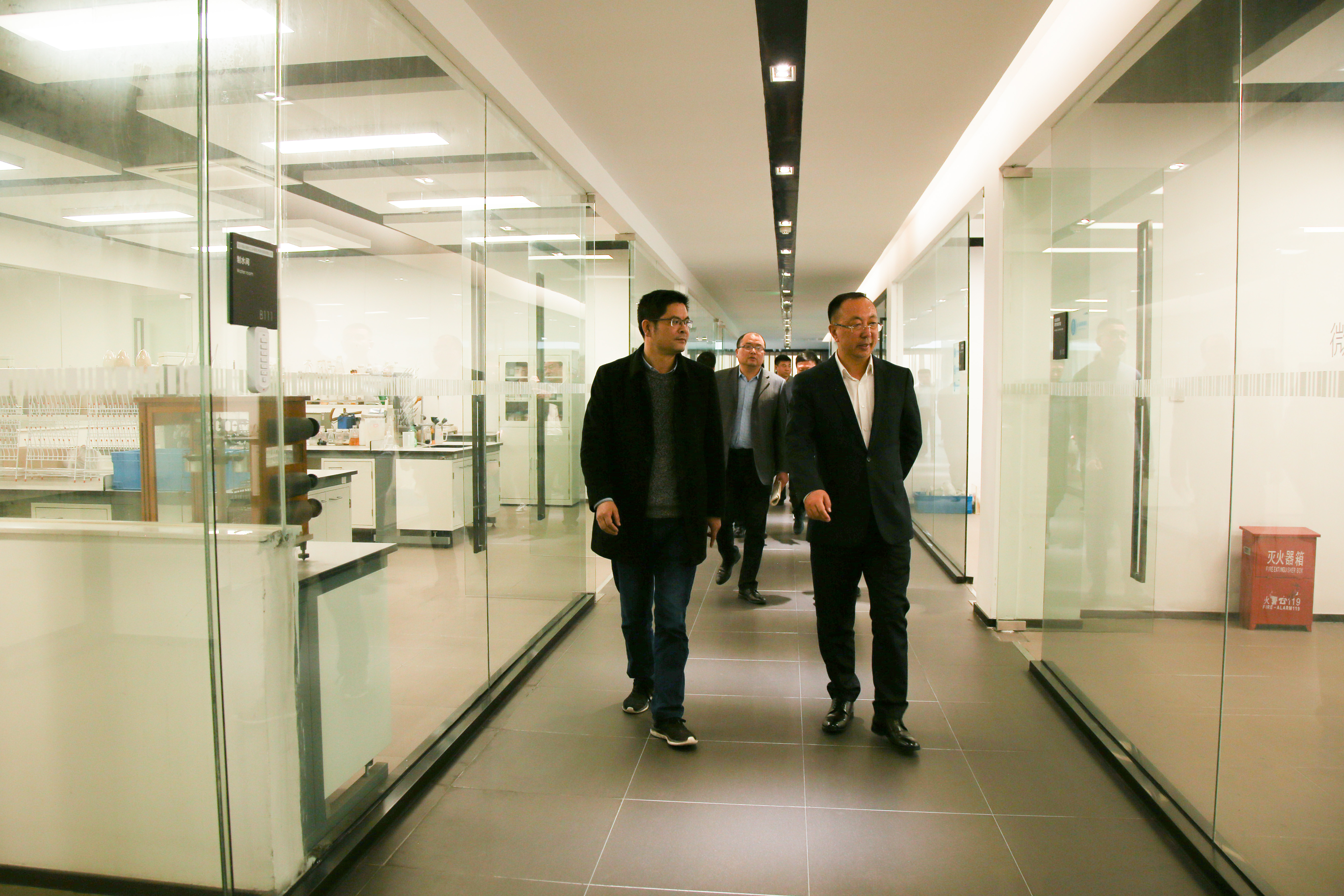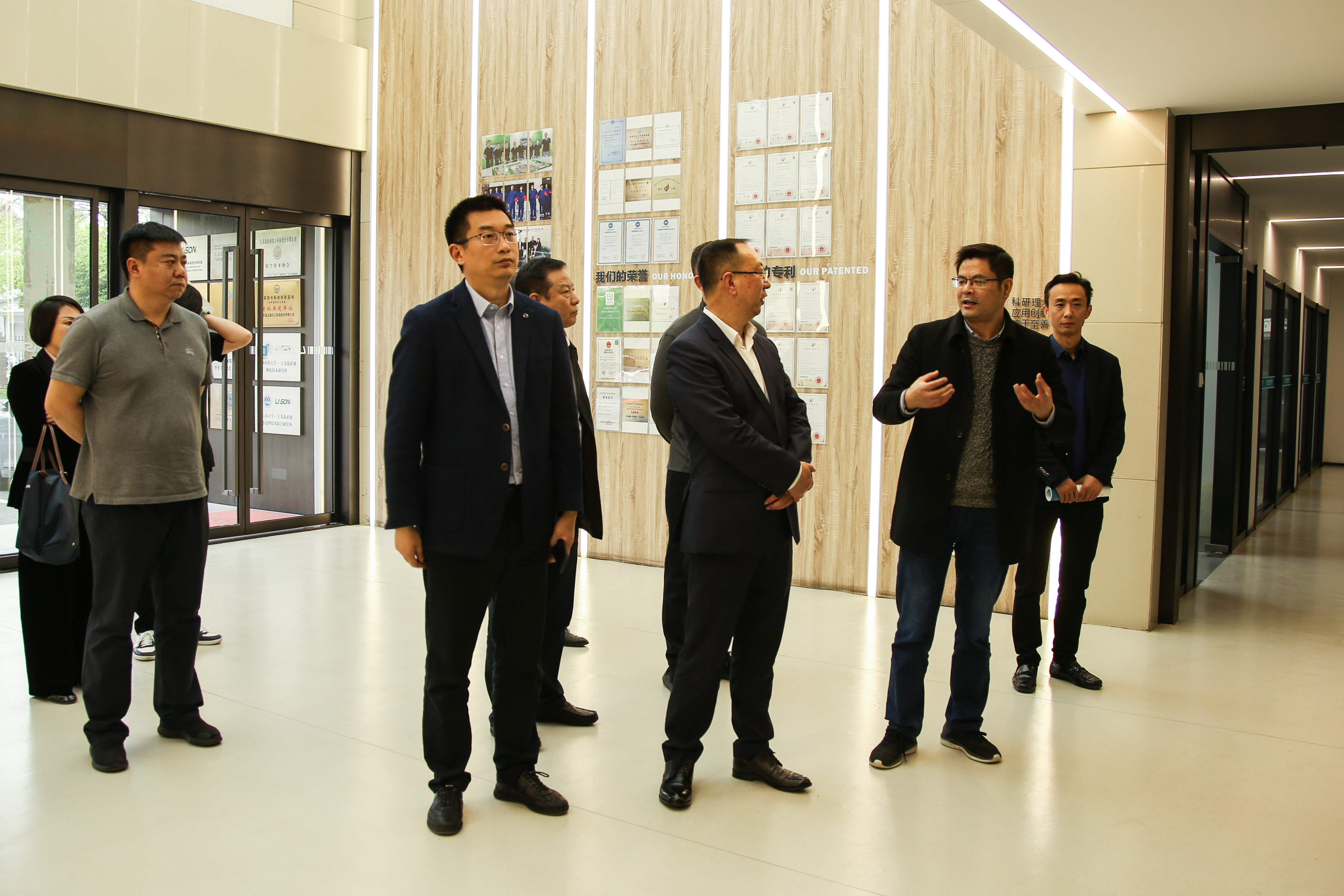一行领导首先在蒋董事长的陪同下参观了蓝必盛总部。林区长对蓝必盛的企业文化、科研实力和近年来的发展给予了高度评价。