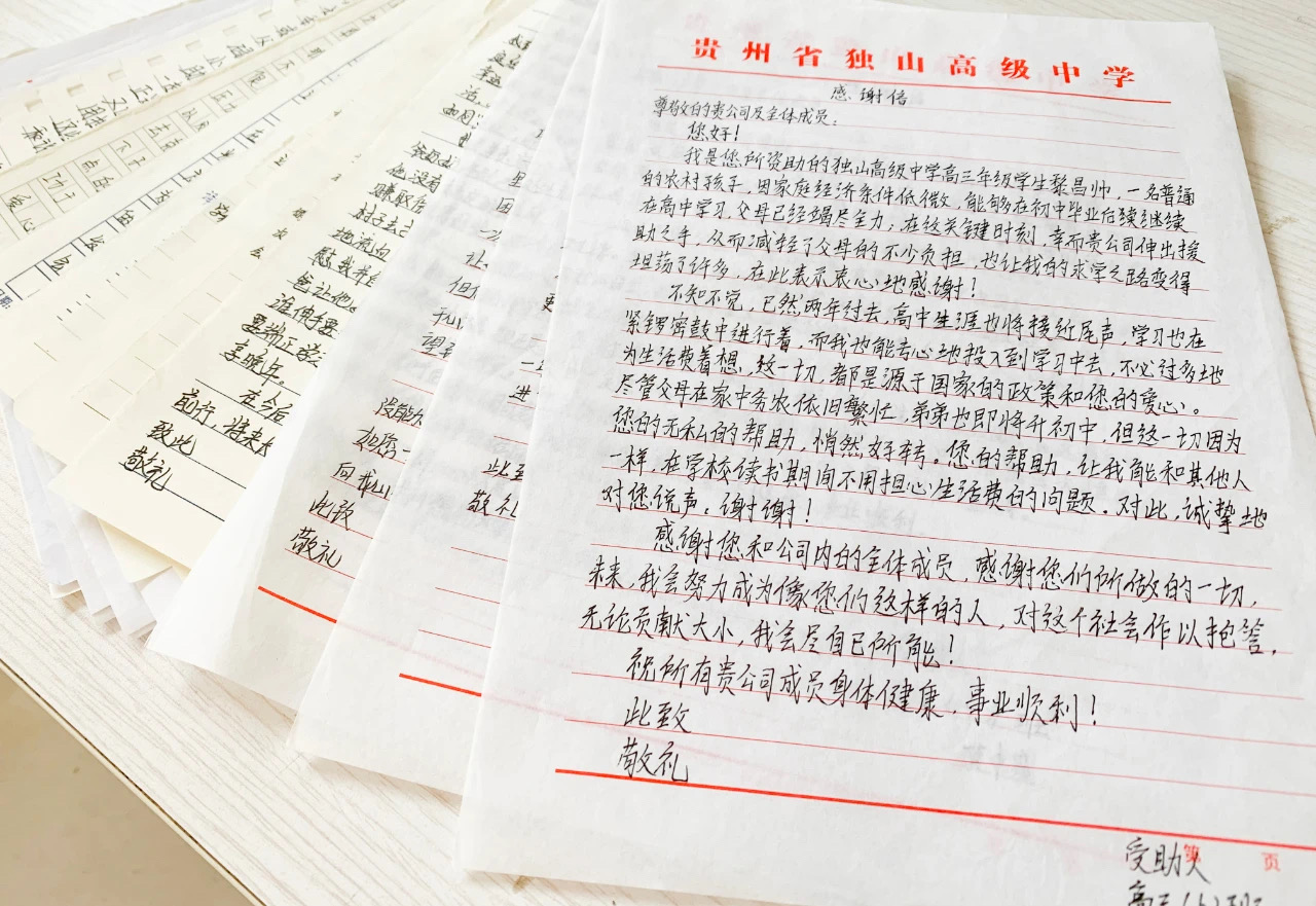 每年,蓝必盛都会收到独山高级中学资助学生的感谢信,信纸虽轻,但字里行间表达了他们对蓝必盛深刻的谢意、立志成才和报效社会的决心。纸短情长,感恩向上的心态,自强不息的精神,从笔尖满溢而出。
