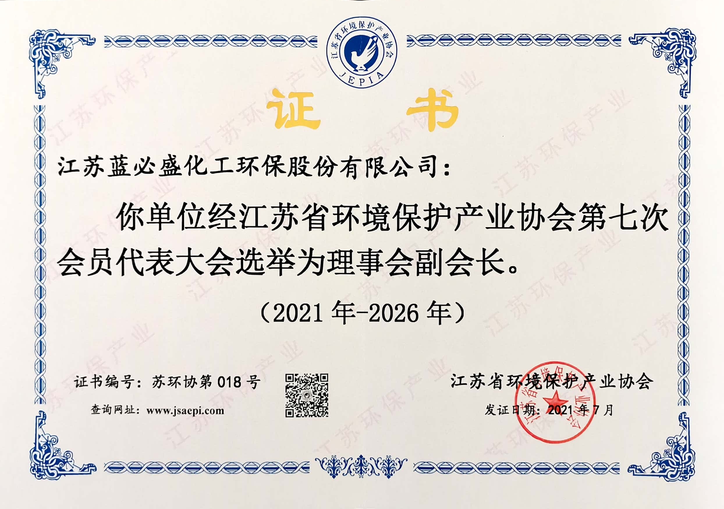 2021年7月19日,江苏省环境保护产业协会第七次会员代表大会在南京召开。经大会审议选举,江苏蓝必盛化工环保股份有限公司实力当选为江苏省环境保护产业协会第七届理事会副会长单位,蓝必盛董事长蒋伟群担任江苏省环境保护产业协会第七届理事会副会长。