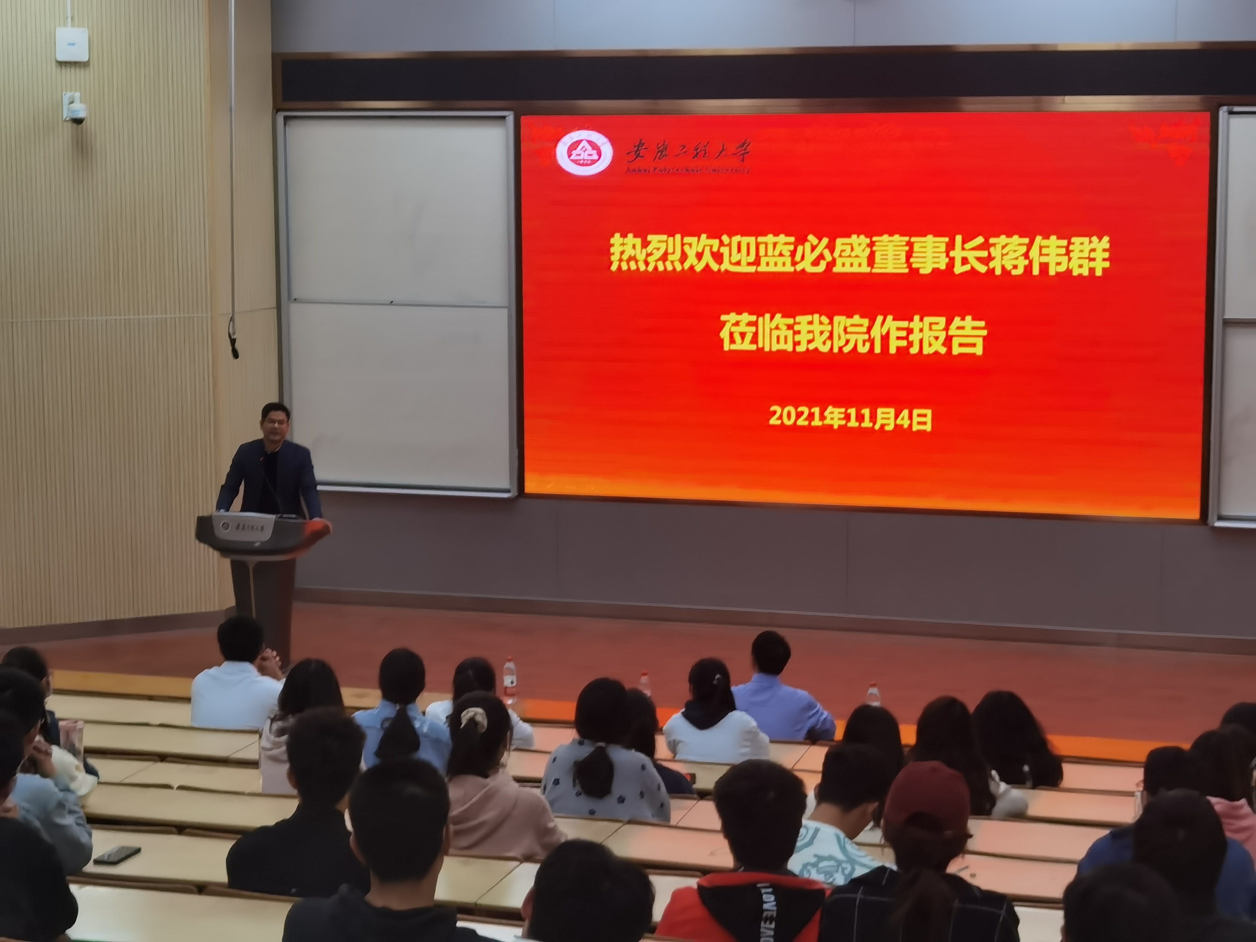 座谈结束后,董事长蒋伟群受邀为化工与环境学院的学生作了就业创业方面的报告,他结合自身经历,以一名环保老兵身份介绍了企业基本情况、优势特色、“三院一平台”等,以及环保产业的发展历程、分布概况和未来方向,并叮嘱广大学生要掌握学习方法、培养沟通能力、增强心理素质,并向学生分享就业创业的经验。