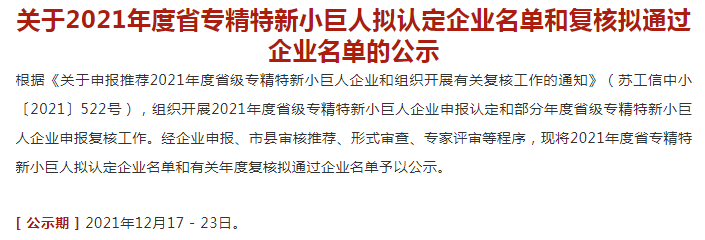 根据近日江苏省工业和信息化厅公布的《关于2021年度省专精特新小巨人企业名单》,蓝必盛成功入选。