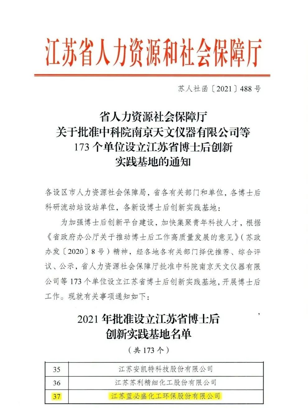 根据近日江苏省人力资源和社会保障厅发布的《2021年批准设立江苏省博士后创新实践基地名单公示》,蓝必盛正式获批江苏省博士后创新实践基地。