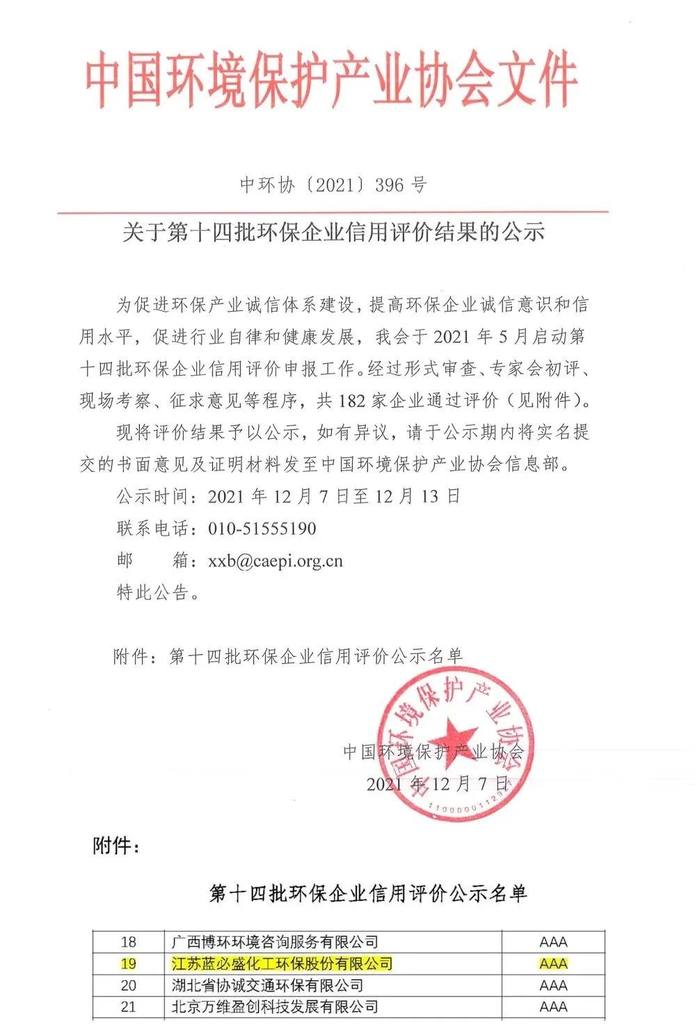 根据近日中国环境保护产业协会对“第十四批环保企业信用评价结果”的公示,共有182家企业通过评价,其中AAA级59家。蓝必盛被评为最高信用等级,即“AAA级信用企业”。这是一项全国性的荣誉,能够在全国众多优秀环保企业中获此荣誉,意义重大。