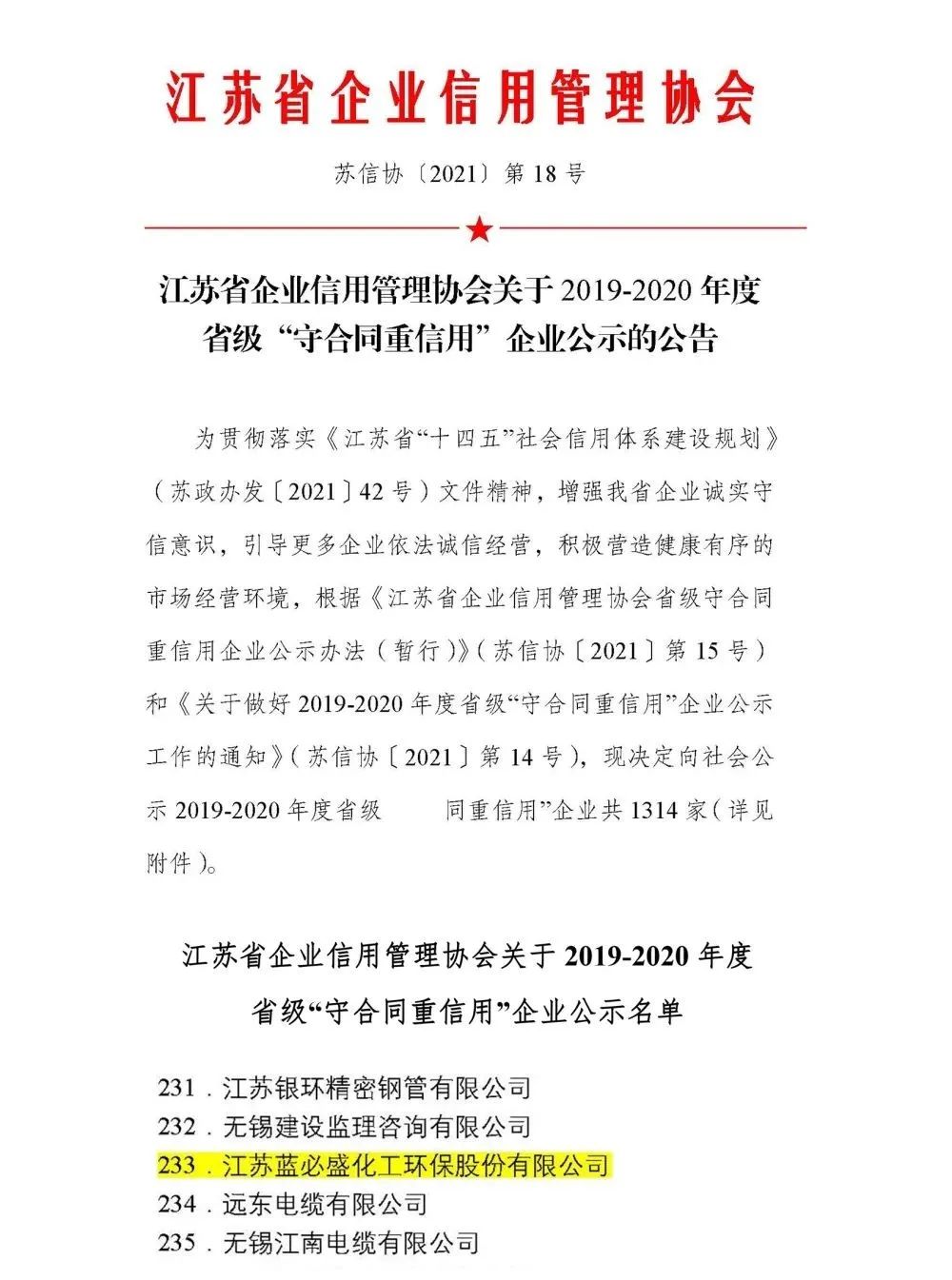 根据近日江苏省企业信用管理协会公示的《2019-2020年度省级“守合同重信用”企业名单》,蓝必盛榜上有名。