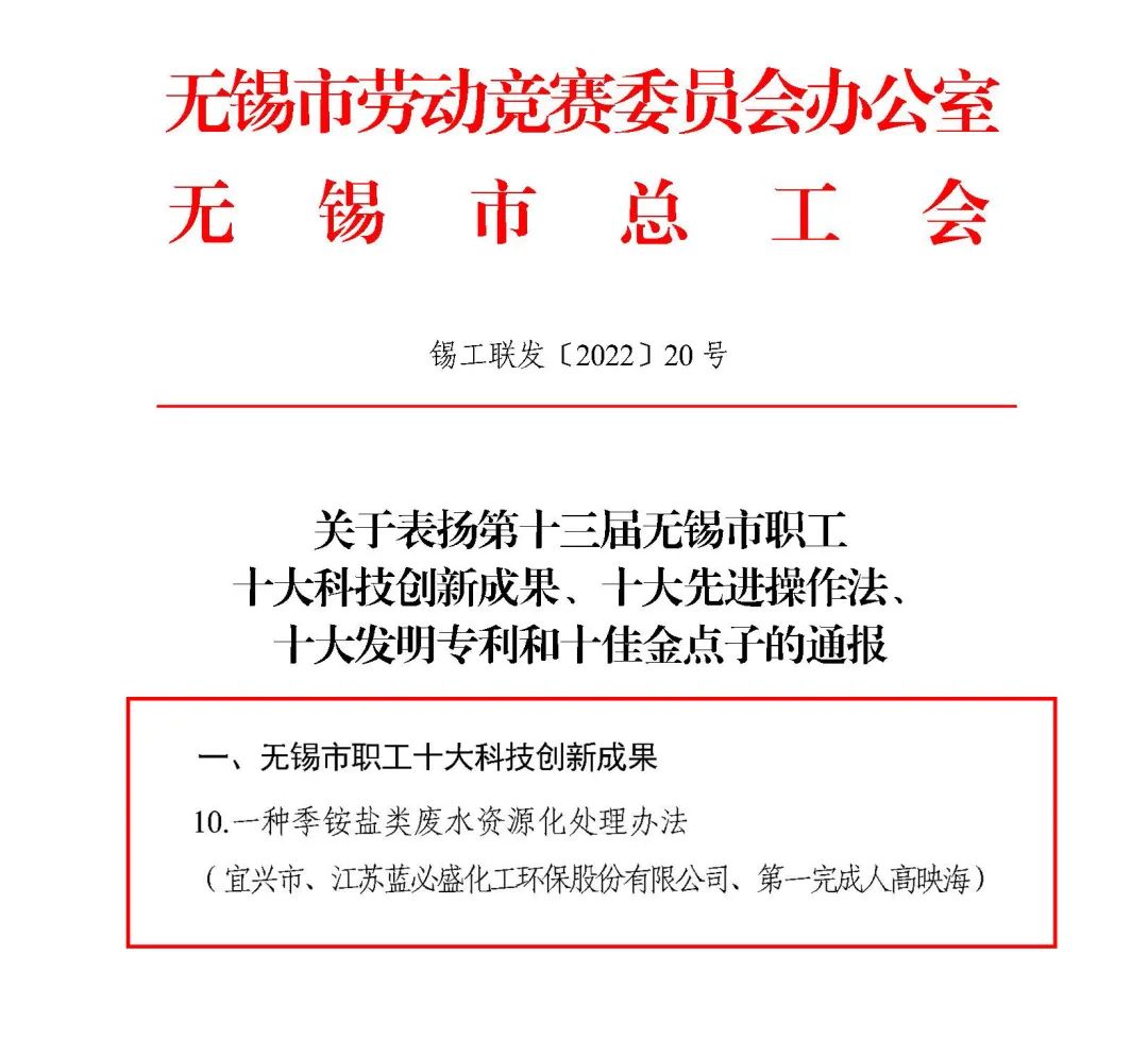 近日,无锡市劳动竞赛委员会办公室、市总工会联合表扬了“第十三届无锡市职工十大科技创新成果、十大先进操作法、十大发明专利和十佳金点子”等奖项。我司职工高映海完成的《在一种季铵盐类废水资源化处理办法》荣获“无锡市职工十大科技创新成果”。